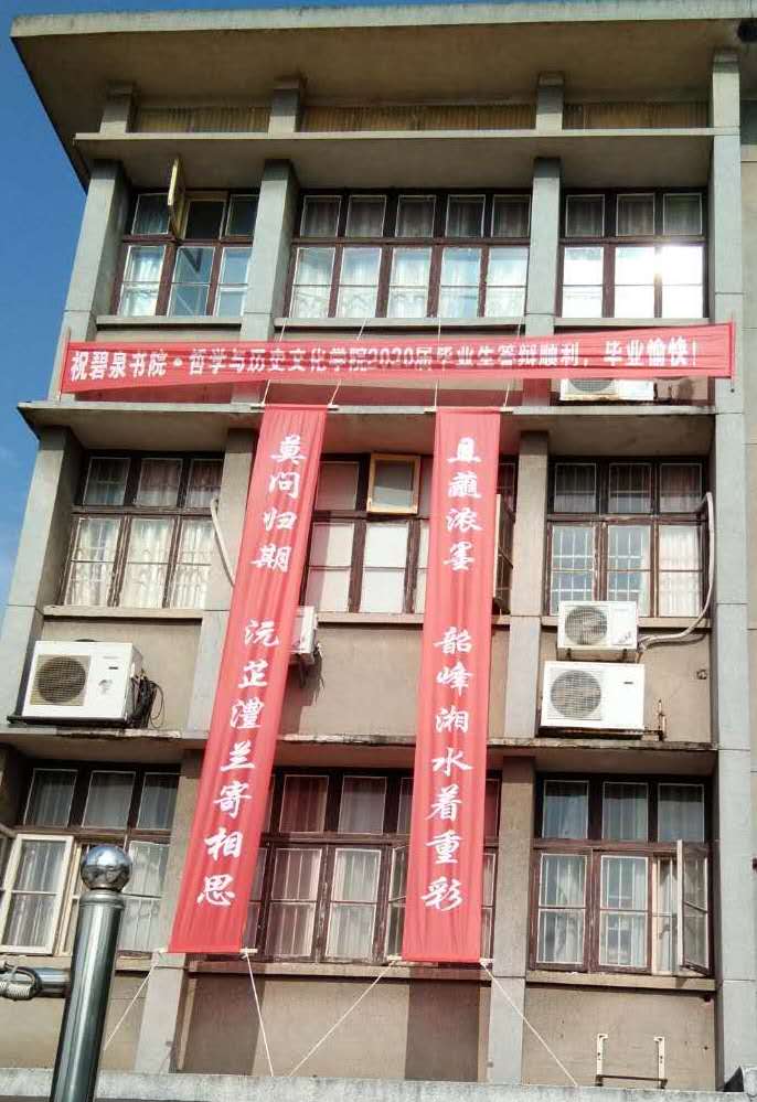 2020届学子顺利毕业的想法,终于在答辩前三天将“且蘸浓墨,韶峰湘水着重彩;莫问归期,沅芷澧兰寄相思”以祝愿“碧泉书院·哲学与历史文化学院2020届毕业生答辩顺利、毕业愉快!”悬挂在办公楼前。