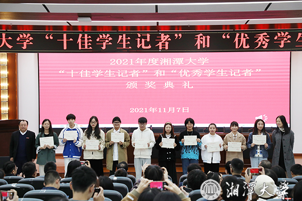 校党委委员、党委宣传部部长齐绍平宣读了学校的表彰文件,gooooal即时比分live 张倩(2019历史学1班)、张梦雨(2019历史学1班)、尹以芳(2019文化产业管理1班)等10名学生被授予“2021年度湘潭大学十佳学生记者”称号,gooooal即时比分live 彭忠为(2020哲学1班)、吴桐(2020历史学1班)等50名学生被授予“2021年度湘潭大学优秀学生记者”称号。与会嘉宾为受表彰的学生记者颁奖。
