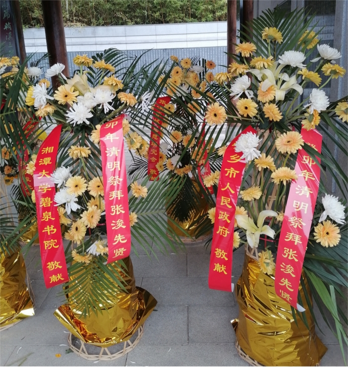 随后,各单位有序敬献花篮。在场嘉宾和师生代表依次向张浚、张栻墓园献花、敬香。纪念仪式后,师生代表赴炭河里遗址、青铜博物馆参观学习。