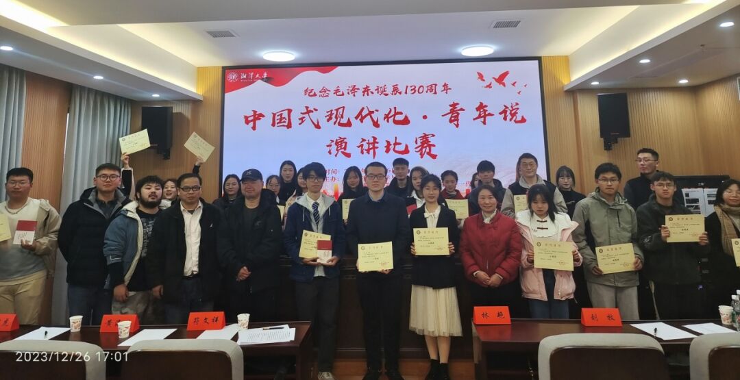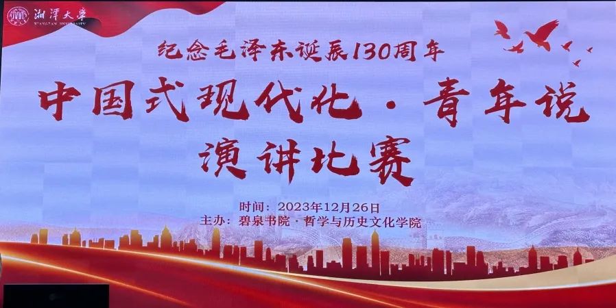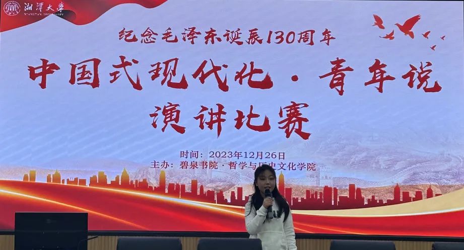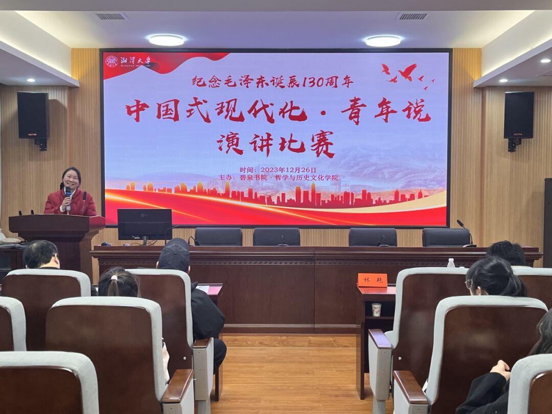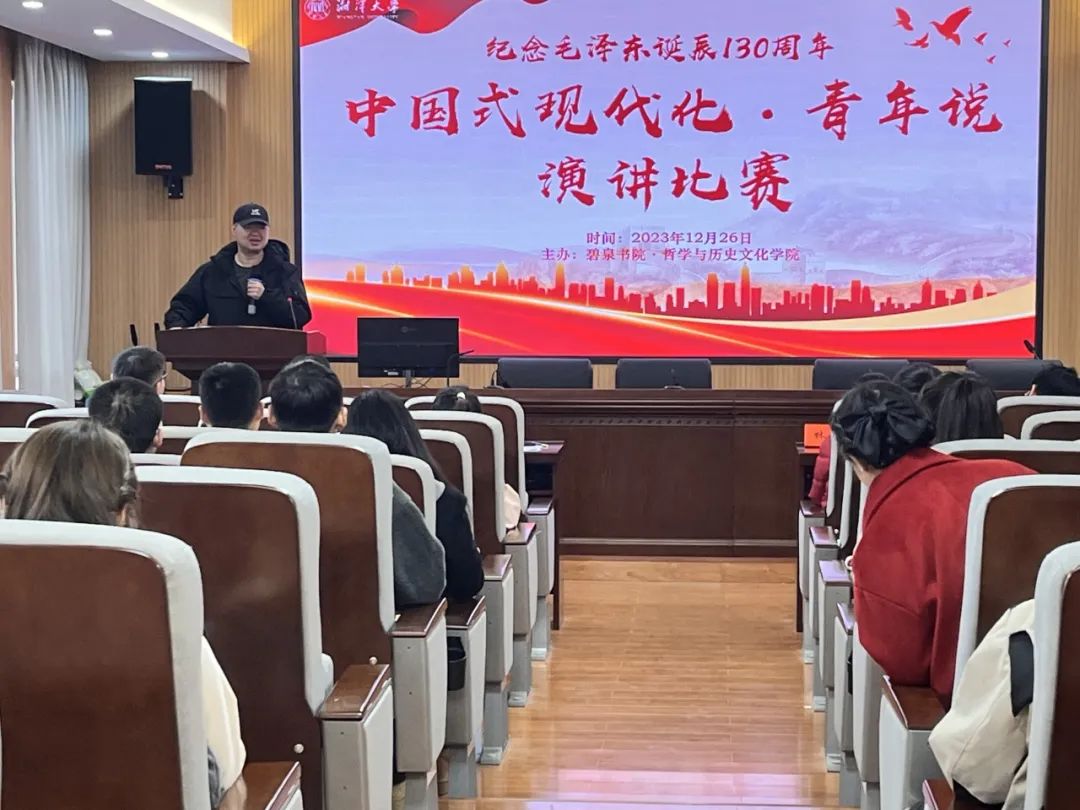 为纪念毛主席诞辰130周年,弘扬毛主席留下的宝贵精神财富,增强学生爱国情怀,培养良好价值观,谱写中华民族伟大复兴的新篇章,2023年12月26日下午,碧泉书院·哲学与历史文化学院在毛研楼东506报告厅开展了以“中国式现代化·青年说”为主题的演讲比赛。