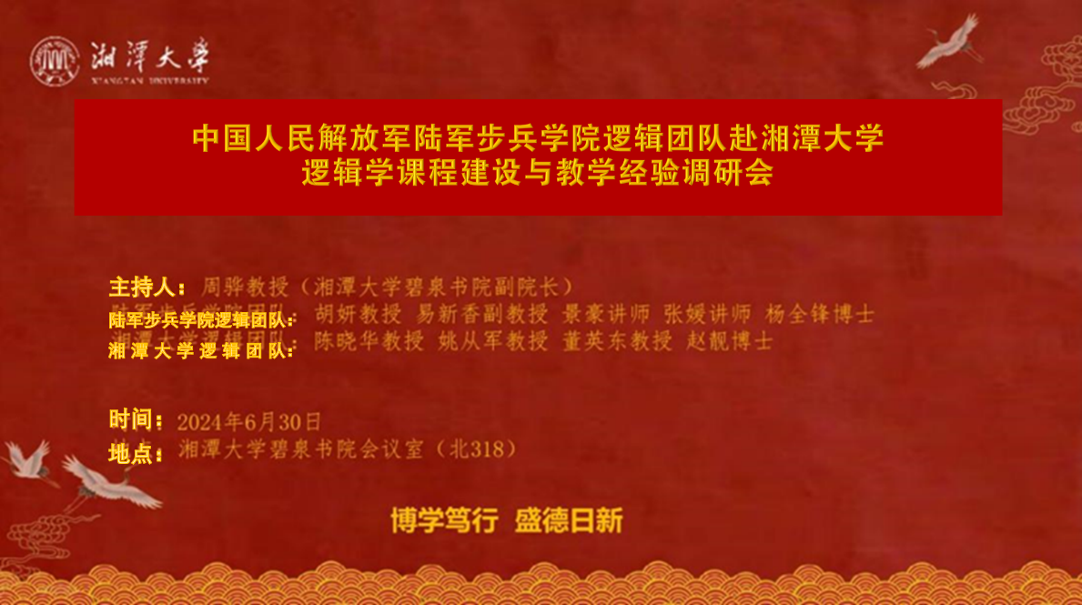6月30日下午,湘潭大学逻辑团队与中国人民解放军陆军步兵学院逻辑团队就逻辑学课程建设与本科教学工作等方面展开了座谈,旨在通过资源共享、科研合作、人才培养与推荐就业等方式,共同推动逻辑教育的高质量发展。此次座谈是双方在逻辑教育领域合作的开局,也将促进提高双方逻辑学建设水平。