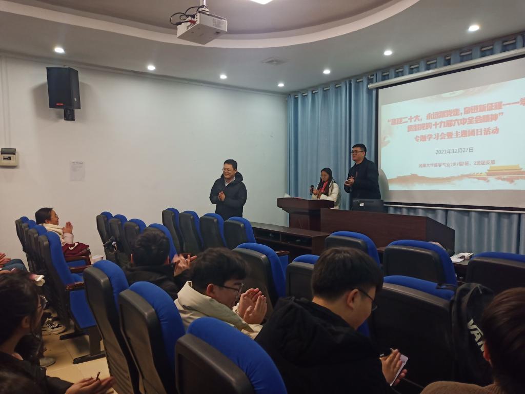 (通讯员:谢昊然)“喜迎二十大,永远跟党走,奋进新征程”。为深刻认识党的十九届六中全会的重大意义,落实共青团湖南省委和校团委的安排部署,在学院团委的指导下,12月27日晚,2019级哲学专业全体本科生在老办公楼511学术报告厅开展“学习贯彻党的十九届六中全会精神”专题学习会暨主题团日活动。2019级哲学2班班主任李锋锋老师出席,1班团支书谢昊然、2班团支书徐佳主持。