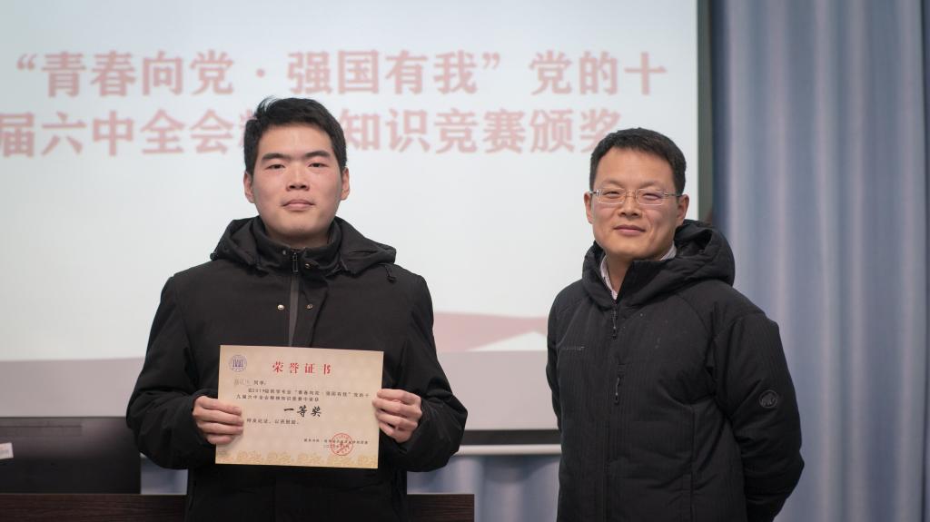 随着庄严的团歌响起,活动正式开始。首先进行的是“青春向党·强国有我”党的十九届六中全会精神知识竞赛。在“听歌识曲”环节中,同学们一边欣赏红色歌曲,一边举手抢答,活跃了竞赛气氛。“争分夺秒”环节,同学们仔细思考,积极答题,在竞赛中学习领悟了十九届六中全会精神。接下来的“你画我猜”环节趣味纷呈,4位同学通过图画展现党史人物和事件,现场传来一阵阵笑声。最后的“巅峰对决”环节,4位同学轮流答题,高手过招,气氛紧张又热烈。全部环节结束后,经统计评定,杨致远同学获一等奖,马圆圆等3名同学获二等奖,龙美菊等4名同学获三等奖,由李锋锋老师为以上获奖同学颁奖。