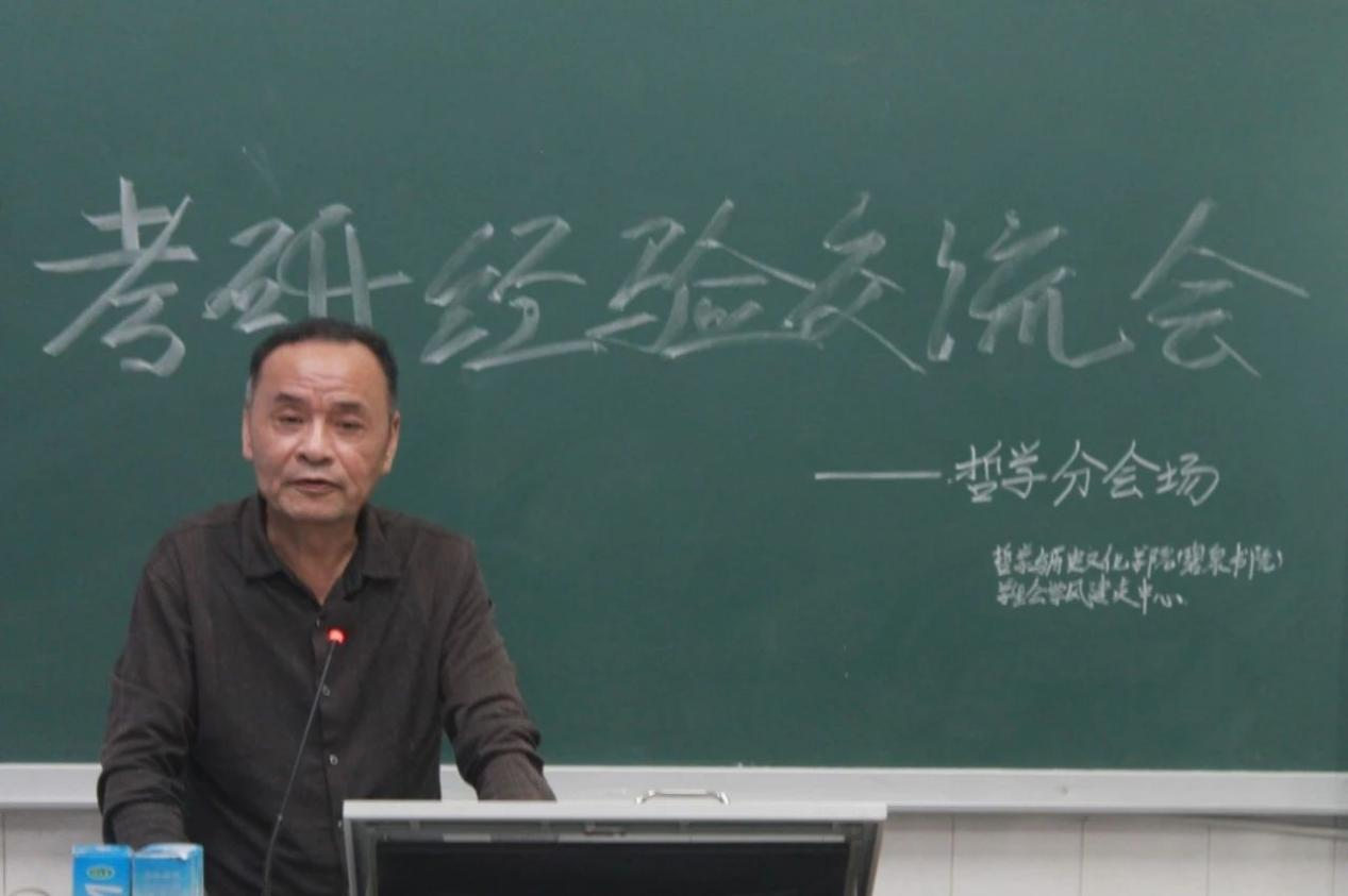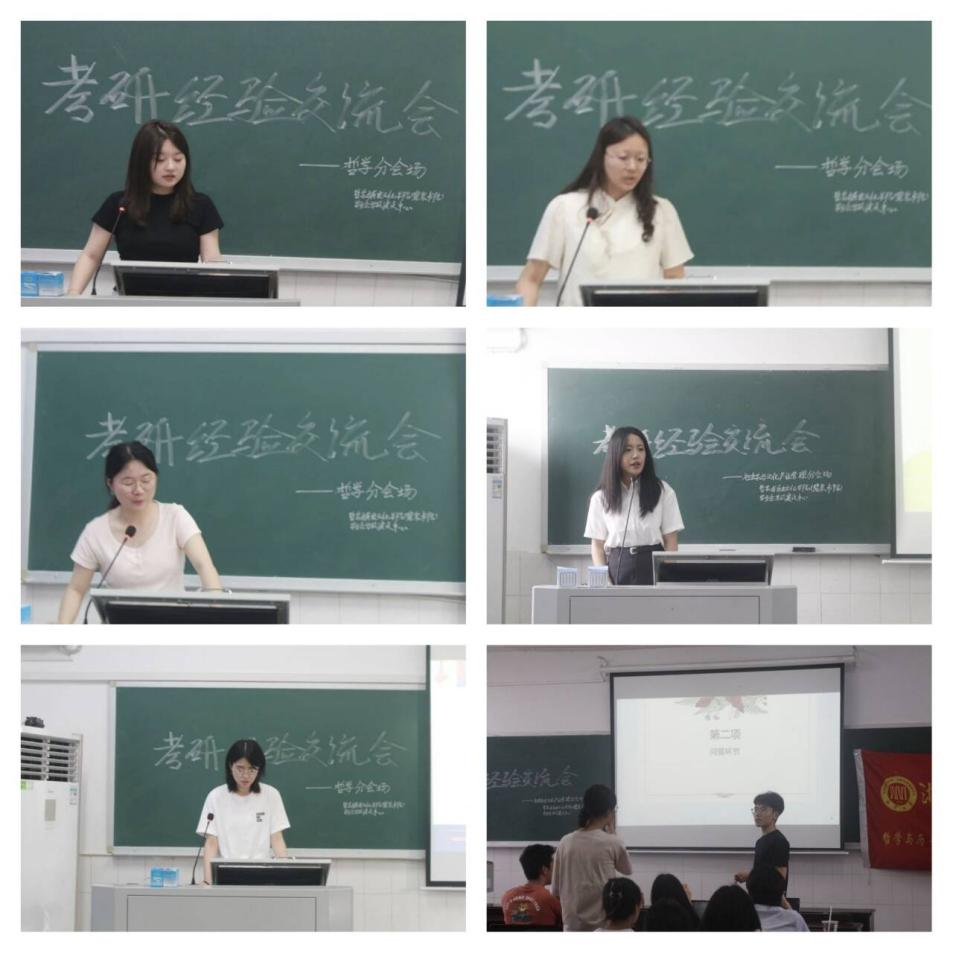 于文科楼同步开展文化产业管理、社会学、哲学专业考研经验交流会。活动邀请2021级优秀毕业生代表分享备考经验,学院关工委副主任宋银桂教授、辅导员及百余名考研学子参与。