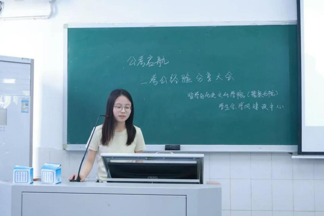 于文科楼305教室举办“公考启航”考公经验分享会。活动邀请2021级马雨晴等4位考公经验丰富的学生代表进行交流,学院备考学生代表参会。