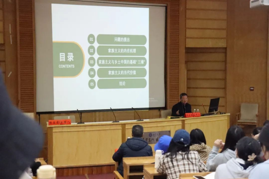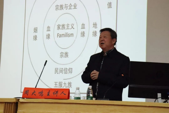 讲座开始,周教授提出问题:家族主义是否不再适应社会发展?继而表示可以从剖析家族主义的内在机理、探讨以家族主义为内核的乡土中国基础“三缘”的变迁路径以及从普遍意义上分析家族文化对于当前社会文化转型的价值三个解题思路来进行剖析。