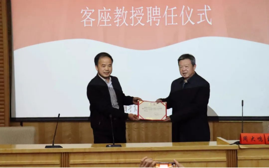 盛明科副校长为周大鸣教授颁发客座教授证书,并为周大鸣教授带上湘大校徽。盛明科副校长对周教授受聘为湘潭大学的客座教授表示衷心的感谢,期待周教授能够经常回家乡,指导家乡大学的建设,也希望湘大学子能够有更多的机会获得周教授的传道受业。