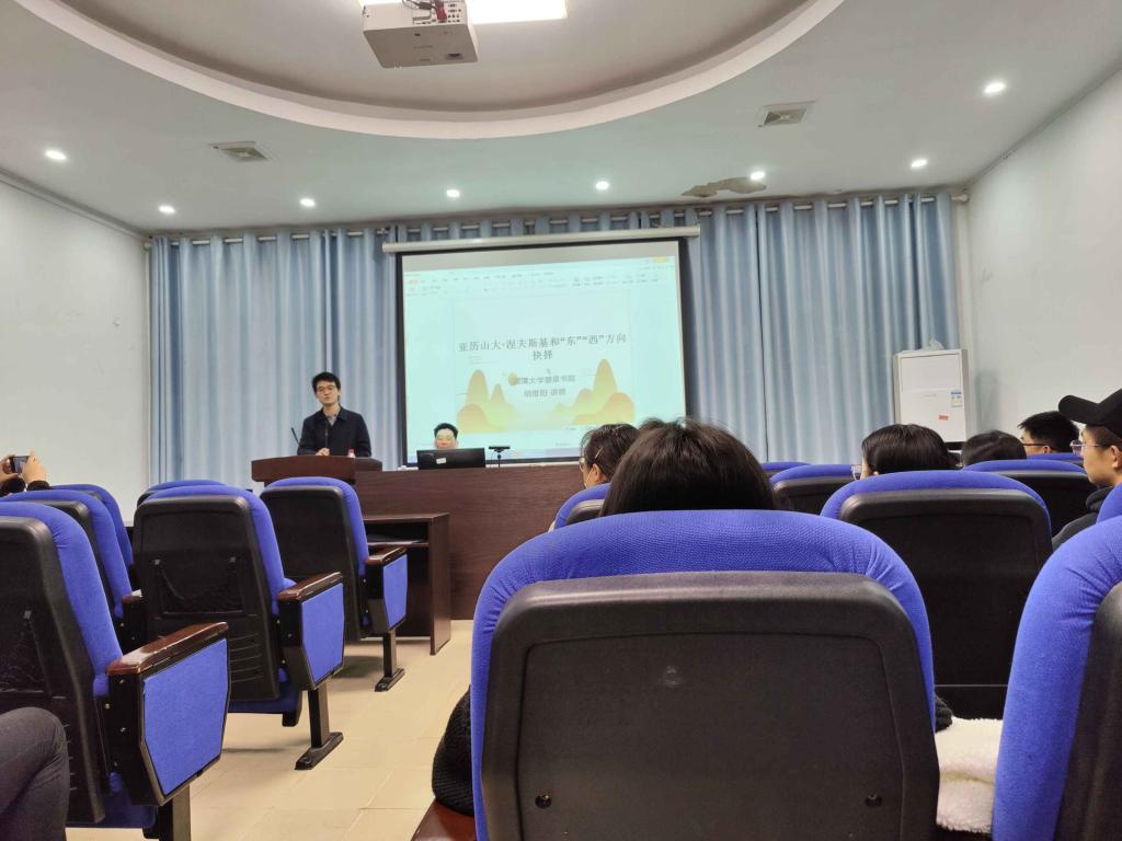 历史系青年教师胡维阳博士主讲,蒋波副院长、瞿亮老师、张骁虎老师、宋翔老师、王杰老师出席,郑鹏副院长主持。