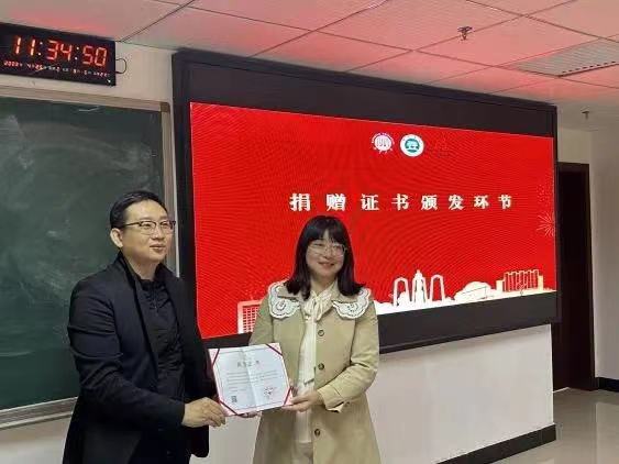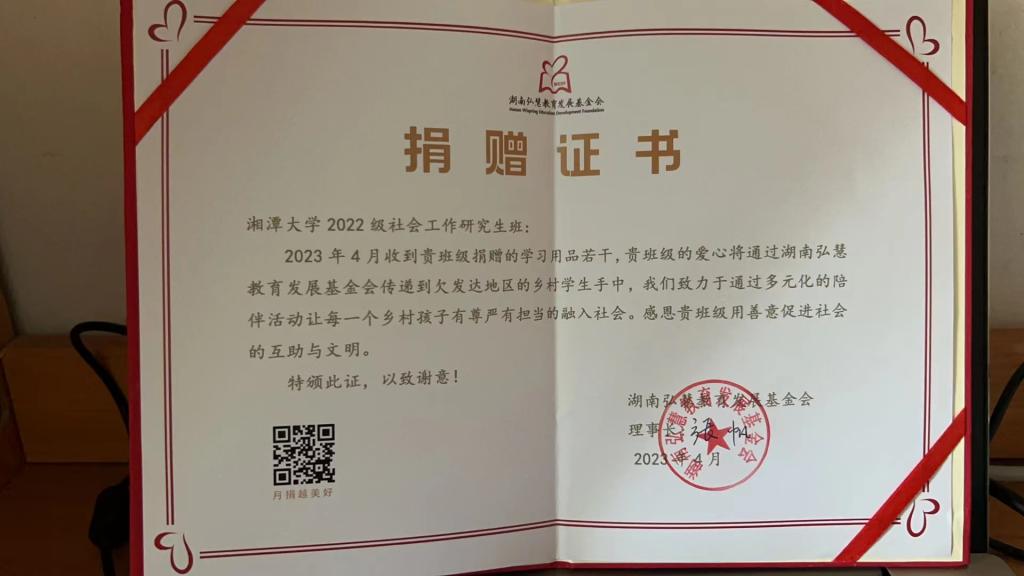 接着,弘慧基金会秘书长李琦为2022级社会工作硕士研究生班颁发捐赠证书,对2022级社工班同学为乡村还在筹集并捐赠物资的公益行为表示感谢和赞扬,由22级社工硕士刘婷代表全班上台领奖。