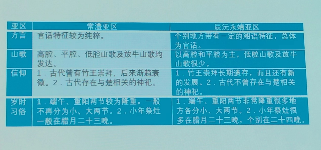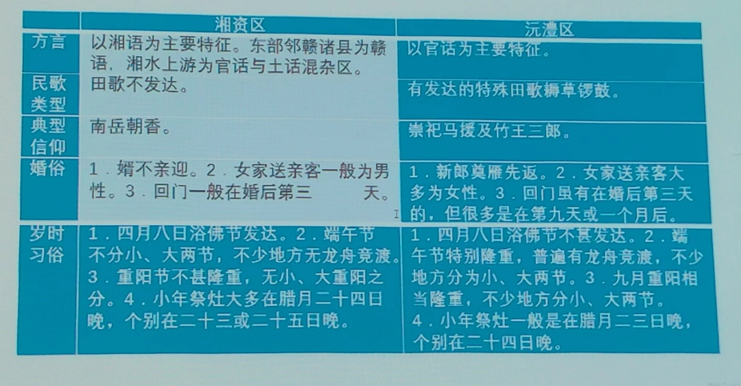 接下来他重点讲述了省域文化的空间分异问题。张教授首先对比了地理学和历史学两个学科在做区域研究上的不同工作及其步骤,并进一步回顾自己是如何一步一步地从地理学研究思维转移到以历史学思维去做研究的历程。在研究成果方面,张教授采用形象可视化的图表,展示了湘资区和沅澧区在方言、民歌类型、典型信仰、婚俗和岁时习俗等方面的不同,尤其是重点分析了他是如何从当地的歌谱籍中,发现湘资区特有的南岳朝香的信仰问题。另外,他也从方言、山歌、信仰、岁时习俗四方面,对比分析了常澧、辰沅永靖、长衡岳、郴桂永和宝庆五个亚区的文化异同。