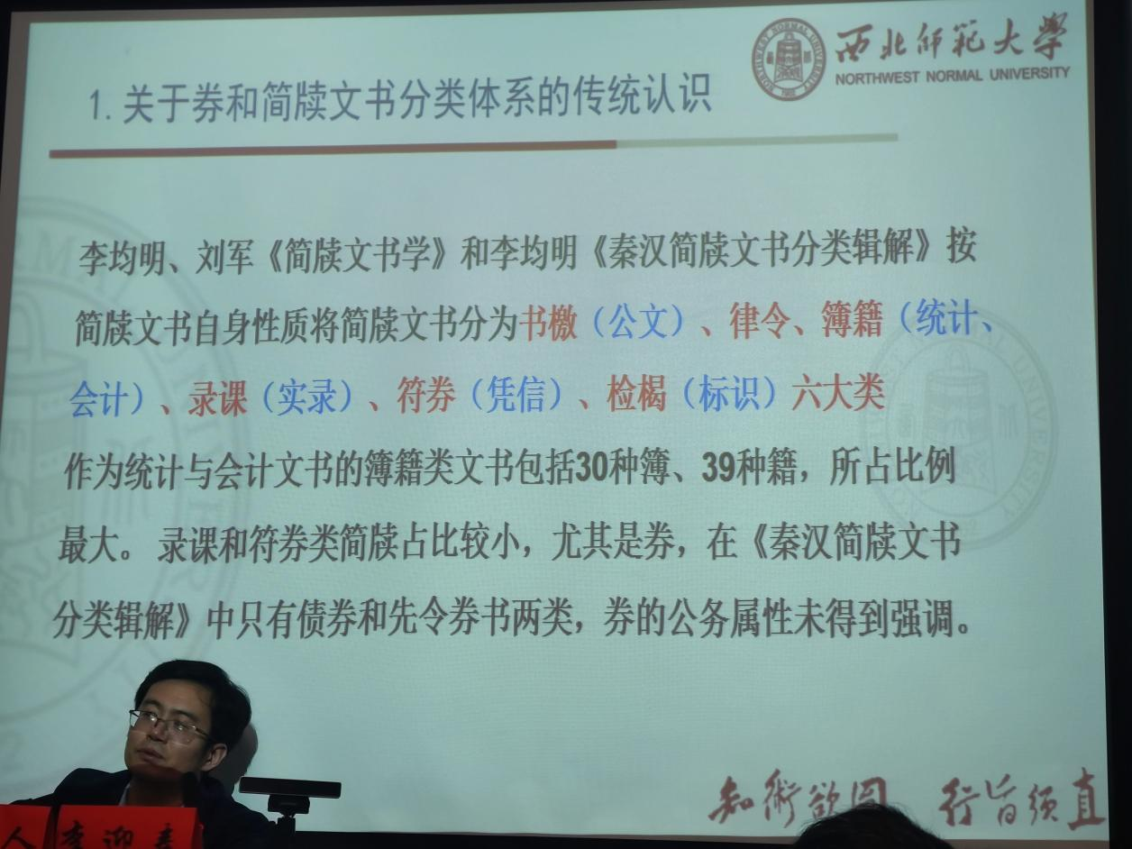 讲座第二环节,正式进入报告的分享。首先,李迎春教授介绍了悬泉汉简的研究现状、传统认识及他本人是如何重新审视相关研究的。传统观点按简牍文书自身性质将简牍文书分为书檄(公文)、律令、簿籍(统计、会计)、录课(实录)、符券(凭信)、检揭(标识)六大类。作为统计与会计文书的簿籍类文书包括30种簿、39种籍,所占比例最大。录课和符券类简牍占比较小,尤其是券,券的公务属性未得到强调。这六大分类方式已经被学界奉为圭臬,对其认识并没有新的突破,但是后来李迎春教授通过《周礼》《文心雕龙》相关细节的发掘引起了对于既定分类方式的怀疑,一方面李迎春教授认为传统观点可能是基于居延汉简这一较单一的研究对象而得出的,但是随着后来新发掘的遗址、新出土的简牍越来越多,学者的认识也越来越丰富,于是更加坚定了新的看法。