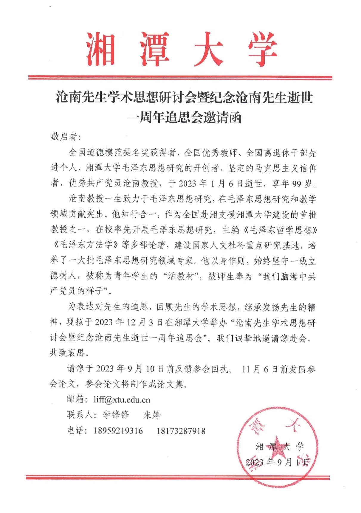 沧南先生学术思想研讨会暨纪念沧南先生逝世一周年追思会邀请函