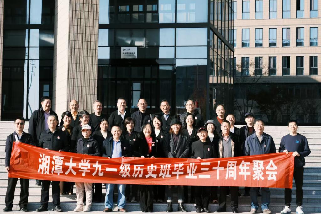 座谈会尾声,全体与会人员在会场外合影留念。此次聚会不仅是一次青春的回顾,更是一次精神的再出发。三十载光阴流转,不变的是湘大人“博学笃行,盛德日新”的精神底色。相信在未来的岁月中,91级历史班的校友们将继续与母校同心同行,携手书写更加灿烂的明天。
