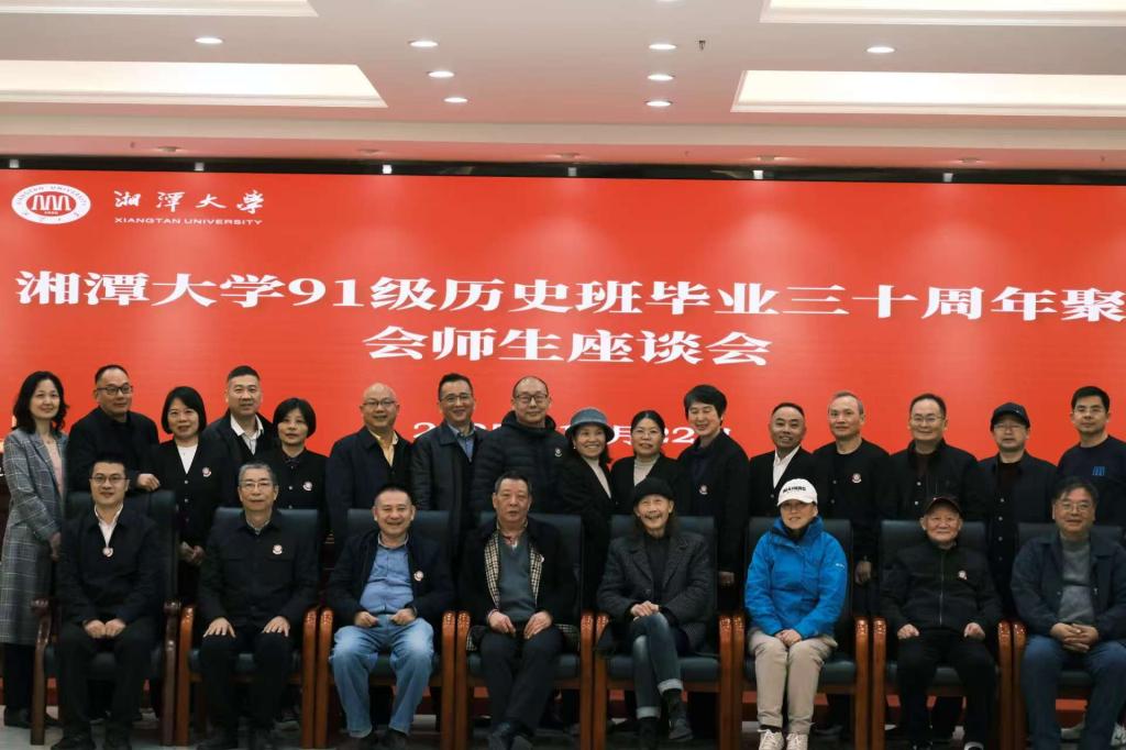 座谈会由91级历史班校友程晖主持。刘启良、洪永红、肖芳林、刘松茂、赵立坤、阎友兵、邹华斌等曾执教该班的教师,湘潭大学副校长葛飞、校友会办公室主任周广、哲学与历史文化学院(碧泉书院)党委书记资义平等出席座谈会。